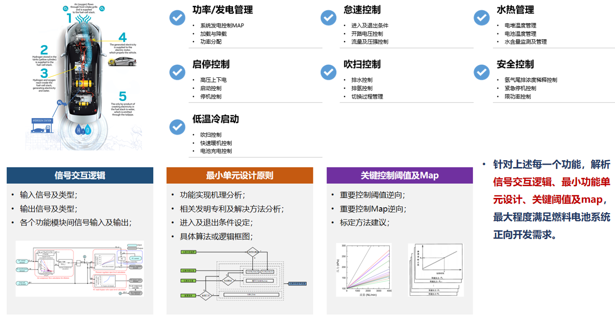 中汽中心工程院燃料電池團隊具備行業內最豐富的“燃料電池控制策略解析”技術,可提供信號交互邏輯、最小功能單元設計方法、關鍵閾值及Map,最大程度滿足燃料電池汽車/系統正向開發需求。
