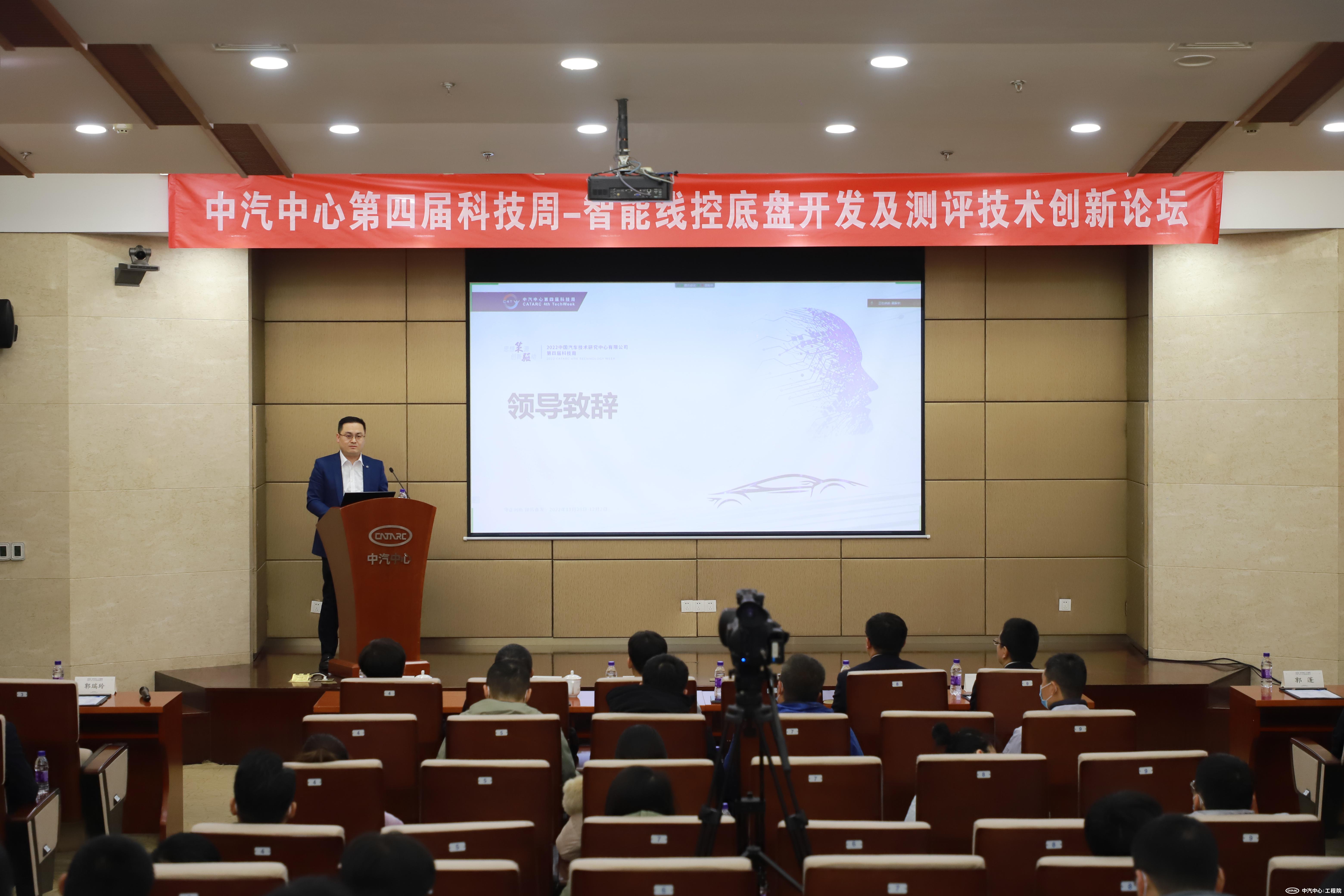 2022年11月30日,由中汽研(天津)汽車工程研究院有限公司(簡稱“工程院”)和中汽研汽車檢驗中心(天津)有限公司(簡稱“天津檢驗中心”)聯合承辦的中汽中心第四屆科技周分會議-智能線控底盤開發及測評技術創新論壇在天津成功舉辦,會議采用線上線下相結合的方式進行,來自整車企業、研究機構、高校等單位的200余位專家學者參加了本次會議。工程院黨委委員、副總經理張志國為大會致辭。