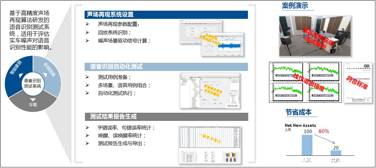中汽中心工程院開(kāi)發(fā)的基于高精度聲場(chǎng)再現(xiàn)系統(tǒng)的語(yǔ)音識(shí)別測(cè)試系統(tǒng),可實(shí)現(xiàn)線性譜級(jí)的聲場(chǎng)還原,可在實(shí)驗(yàn)室內(nèi)位客戶提供低成本、高一致的噪聲模擬環(huán)境。同時(shí),“人工嘴”會(huì)代替測(cè)試員用普通話和各地方言說(shuō)出200余款常用指令,檢測(cè)系統(tǒng)則會(huì)自動(dòng)檢查車(chē)輛是否準(zhǔn)確識(shí)別指令并根據(jù)指令要求做出相應(yīng)響應(yīng),并將檢查結(jié)果自動(dòng)生成報(bào)告,為客戶提供可靠的車(chē)載語(yǔ)音識(shí)別的抗噪性能解決方案!完美承接語(yǔ)音識(shí)別的海量測(cè)試需求。