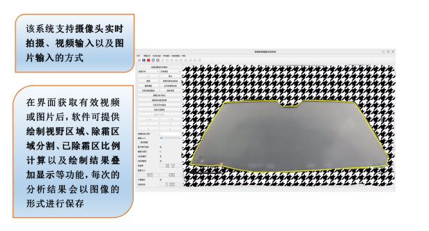 除霜分析系統(tǒng)不僅支持實(shí)時(shí)的顯示與計(jì)算分析,還支持試驗(yàn)錄像,通過錄像分析也可以使用分析軟件的所有功能。一方面,該系統(tǒng)可同時(shí)錄制來自多個(gè)攝像頭的視頻流;另一方面,也可錄制特定視頻的分析和處理結(jié)果。此外,在繪制視野區(qū)后,除霜分析系統(tǒng)可以計(jì)算并顯示已除霜區(qū)域占各個(gè)視野區(qū)的比例,分析結(jié)果同樣以圖像的形式保存在相應(yīng)的文件夾中。