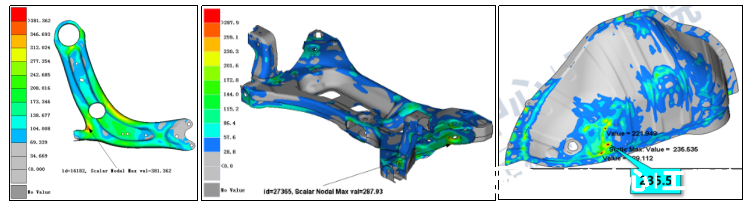 為了克服上述挑戰,我司團隊引入了虛擬試驗場(VPG)技術,采用VPG虛擬仿真技術,模擬實車在路面上的遇到的各種路況(路障、路沿、方坑等)。該技術不僅能夠精確分析汽車在各種復雜工況下的動態結構響應,還能有效預測潛在的強度風險,技術團隊對模型在不同數字路面上進行多輪次、多場景的仿真分析,涵蓋各種可能遇到的道路狀況、不同車速以及駕駛行為等因素。在仿真過程中,密切關注結構應力應變、屈曲和殘余位移等指標的變化,以評估結構強度的安全性、可靠性及維修性,給車身及底盤等輕量化帶來合理設計邊界,在兼顧整車安全的同時,更好地為汽車產品輕量化設計提供支撐。在開發過程中,研發人員可以根據這些預測結果,針對性地優化車輛結構設計,增強車身及底盤等結構的強度、屈曲及螺栓緊固件等,從而避免在實際使用中出現強度誤用問題,幫助汽車廠商避免潛在的安全隱患。有效縮減企業的研發開支,減少試驗次數和優化設計流程,降低企業的運營成本,同時加快新車型的研發速度。